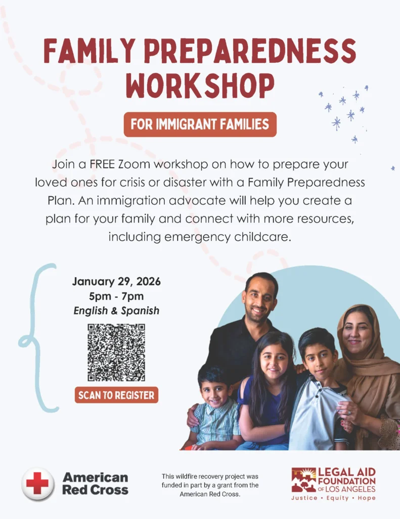 If you and your family are concerned about your rights and protections as immigrants during and after a crisis or disaster, join this free virtual workshop for practical steps to stay safe and prepared. You’ll learn about your rights during emergencies, build a personalized Family Preparedness Packet, and connect with resources to support your recovery and safety.