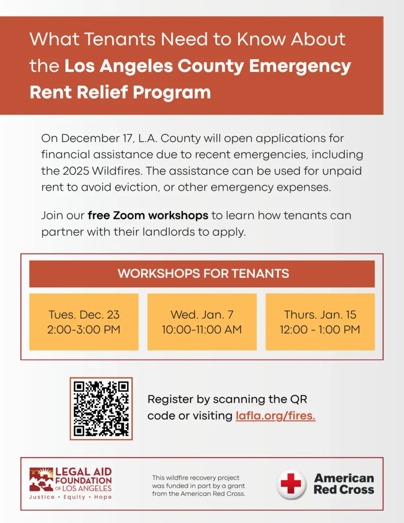 On December 17, L.A. County will open applications for financial assistance due to recent emergencies, including the 2025 Wildfires. The assistance can be used for unpaid rent to avoid eviction, or other emergency expenses. Join our free Zoom workshops to learn how tenants can partner with their landlords to apply.
