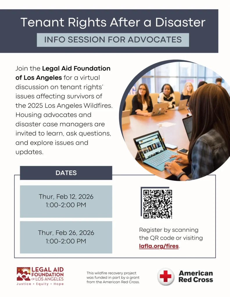 Join the Legal Aid Foundation of Los Angeles for a virtual discussion on tenant rights’ issues affecting survivors of the 2025 Los Angeles Wildfires. Housing advocates and disaster case managers are invited to learn, ask questions, and explore issues and updates.